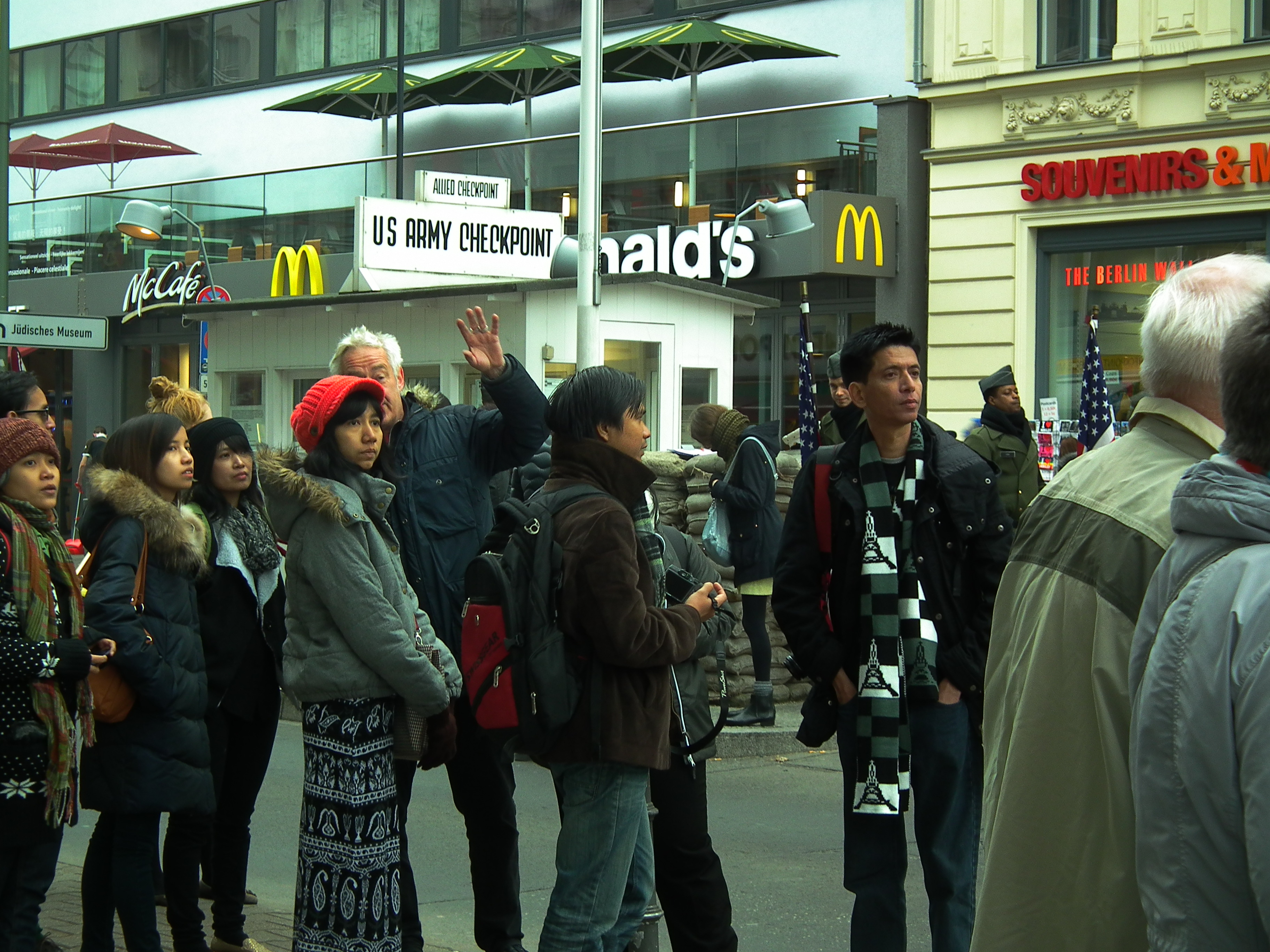 Before long, Checkpoint Charlie reached. Representing the old crossing point from the Soviet controlled area of the East to the American section of the West, this is now, like every other historical point of significance throughout the world, a honey pot for tourists (myself included of course). It is perhaps with some irony that McDonalds occupies the vistas of Checkpoint Charlie so heroically, “You are now entering the America sector” the sign reads, how true. Given the tourists, it was hardly surprising to see the tat, superficiality, commercialism interspersed with people begging, hassling you for money, perhaps trying to con you into donating to a sham charity. Checkpoint Charlie therefore can be viewed as a microcosm of how Berlin has swapped one form of duality for another.
