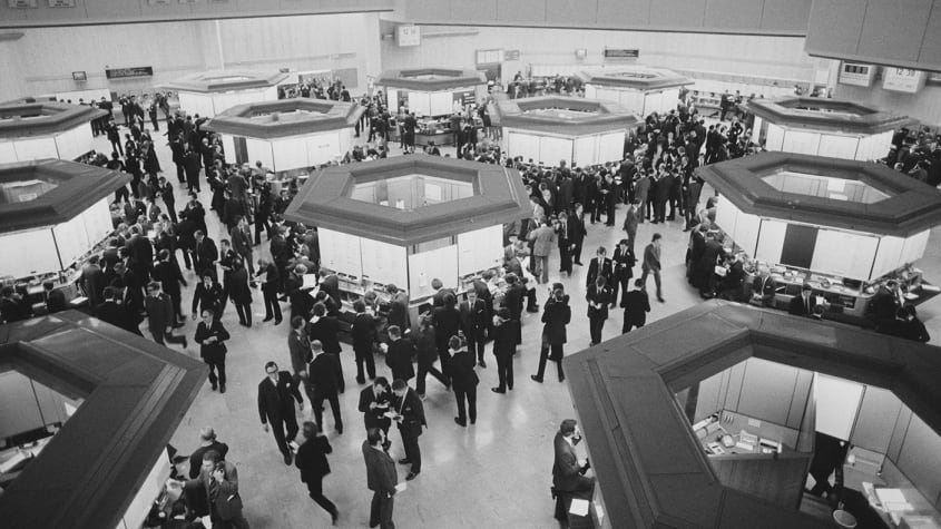 Well, there are two things to pick apart here: first is the blockchain itself. For all its fanfare, the ‘blockchain’ is really a bastardised extension of the neoliberal worldview of increasing the reach of marketization into ever-deeper recesses of everyday life. The Big Bang in 1986 saw Margaret Thatcher’s Conservative government in the UK deregulate the banks to allow use technology to process market decisions rather than humans shouting across the trading floor (pictured above). The relentless lobbying by the London Stock Exchange to change the rules, spurred on wealthy US banks looking to cash in, meant that literally overnight, market mechanisms of unfettered competition embedded the ephemerality (and unpredictability) of trading floors, into the microprocessors of computers. It was heralded as allowing the markets to allocate wealth more fairly around anyone who had the technology to join in, utilising the Hayekian philosophy of ‘competition being a discovery procedure’; essentially, the more the market spreads, the more equitable and indeed democratic, the allocation of recourses becomes.